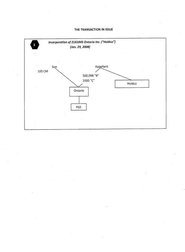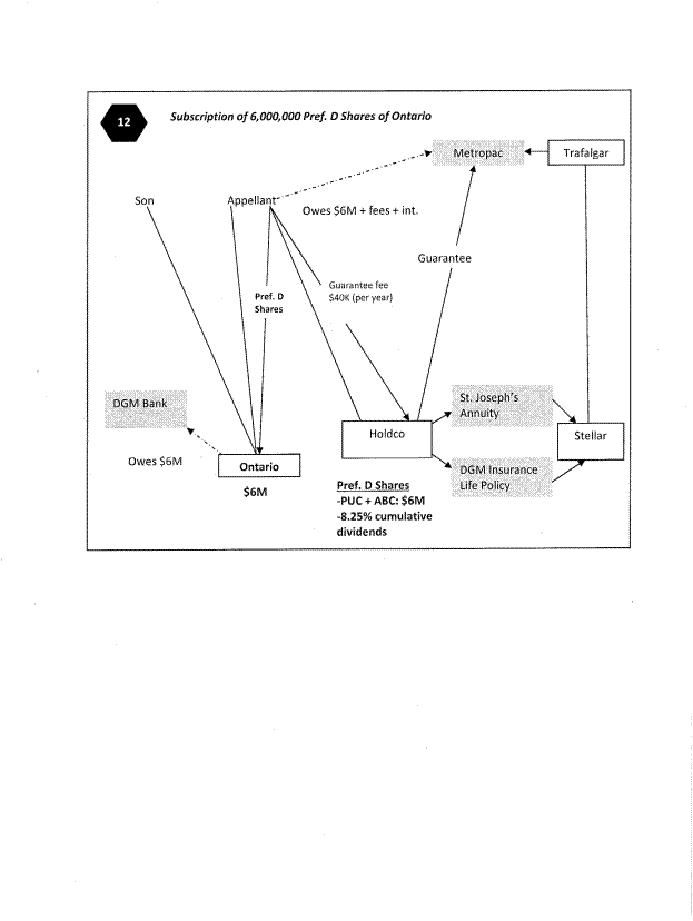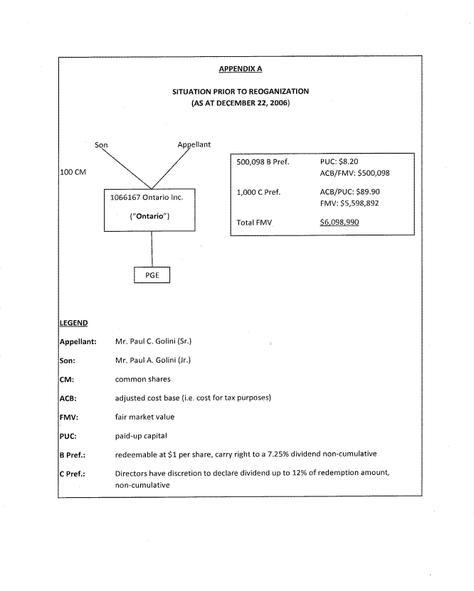 [4] This is all shown schematically in Appendix A attached to these Reasons. Two of the results of the plan were, first, the ability of Paul Sr. to deduct interest on the Metropac loan from his RCA income and second, the increase in the paid up capital of shares held by Paul C. Golini in Ontario Inc.