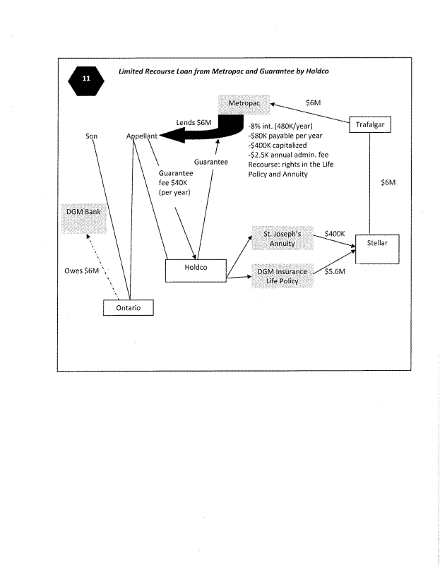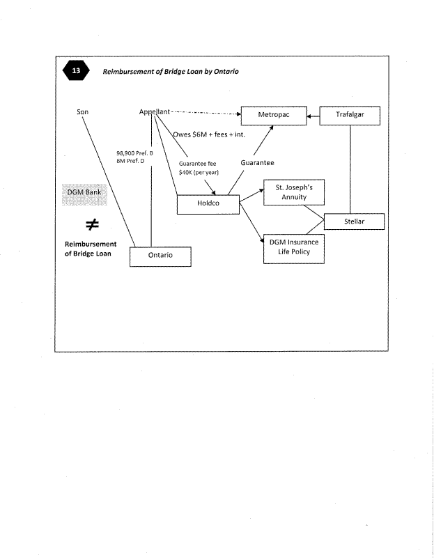 [21] I am also satisfied the families were not aware of the machinations that moved the $6,000,000 proceeds of the bridge loan from Ontario Inc. to St. Joseph’s to DGM Insurance to Stellar to Trafalgar and into (and coincidentally out of) the hands of Metropac. Mr. Etcovitch acknowledged that all he was concerned about from his client’s perspective was that ultimately Metropac had the $6,000,000 to loan to Paul Sr. More on that later when going over the escrow agreement.