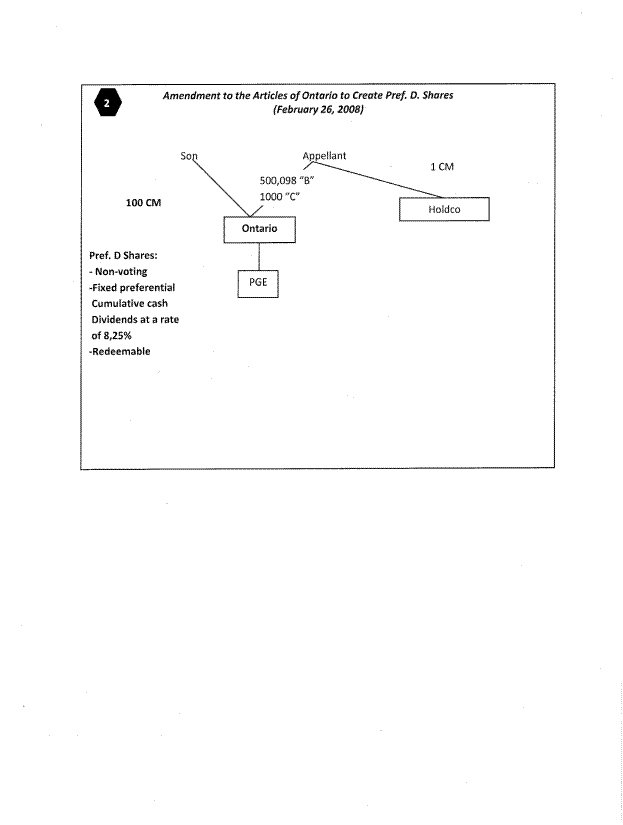 [11] A second step in the overall planning was an estate freeze in late 2006. This freeze was to shift growth in the business from Paul Sr. to Paul Jr. and utilize Paul Sr.’s $500,000 capital gain exemption. Accordingly, Ontario Inc.’s articles were amended to authorize common shares, Class B preferred shares and Class C preferred shares. Paul Sr.’s 100 common shares were exchanged for 500,098 Class B preferred shares with a fair market value of $500,098, plus 1 common share, which was changed into 1,000 Class C shares redeemable at $5,598,000 and 100 common shares. Paul Sr. then gifted the 100 common shares to Paul Jr. At this stage the paid up capital of the shares held by Paul Sr. in Ontario Inc. was nominal.
