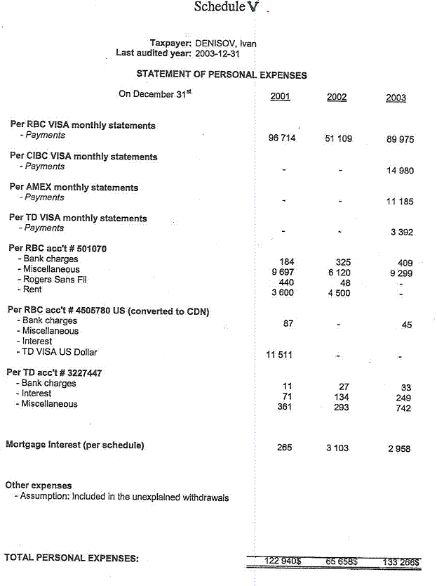 [3] The unreported income for the three taxation years in question was determined through a review of the appellant's banking transactions in the three Canadian bank accounts he held in Canada with the Royal Bank of Canada and the Toronto Dominion Bank. His personal expenses were calculated through the use he made of his credit cards (four in total) and through the withdrawals from the bank accounts, some of which withdrawals were identifiable (bank charges, interest) and others were unexplained. In this regard, the numbers can be found in Schedules V and VI to the net worth calculations, attached to these Reasons.