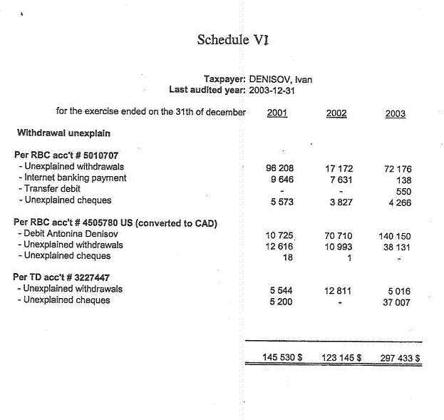 [52] With respect to the remaining net worth numbers, they are made up of personal expenses of $122,940, $65,658 and $133,266 and unexplained withdrawals of approximately $95,000, $123,145 and $297,433 for the years 2001, 2002 and 2003 respectively. The evidence heard did not provide any explanation for the withdrawals or indicate how the appellant met his personal expenses. In fact, the only evidence submitted with regard to the source of the money came from the appellant, who stated that it all came from transfers from his family. Deposits through bank accounts were identified in some cases as coming from his mother in Russia and in others as coming from companies in which his brother was involved, in Russia as well. Neither his mother nor his brother was called as a witness to corroborate the appellant's testimony, identify the transfers, explain why they were made and identify the Russian companies.