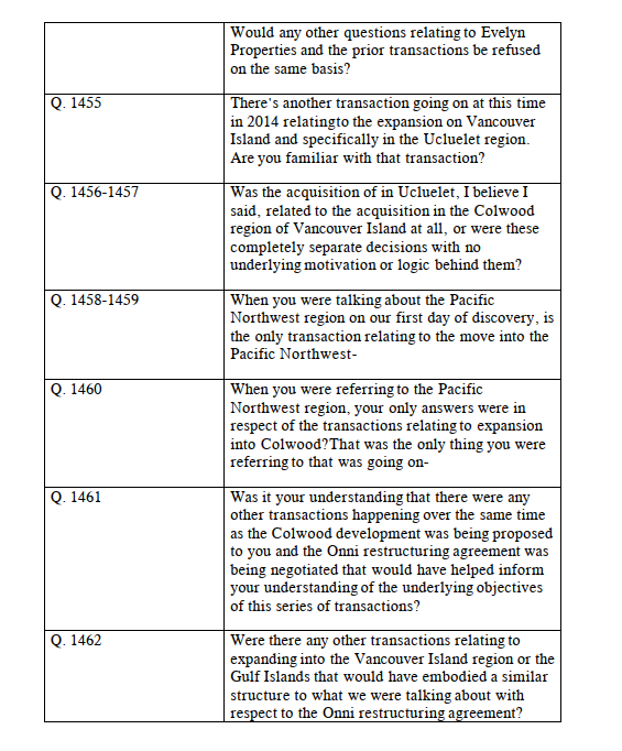 [103] It is the position of the Respondent that Onni failed to fulfill its undertaking which it accepted at the examination for discovery. It is of the view that the reason why the company was incorporated, its potential role in the series that includes the Colwood Project Restructuring, whether there was any plan to have it fulfill that role and what happened to such role all relate to the determining the purpose of the challenged transactions. In the Respondent’s estimation, saying that 1019074 BC Ltd. did not end up having a role is not fully responsive to Onni’s accepted undertaking.
