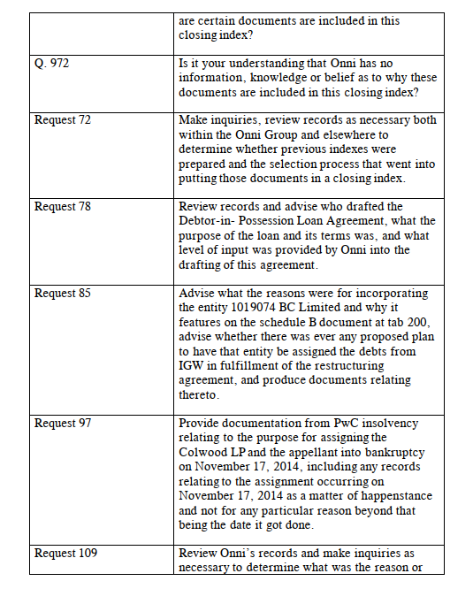 [107] I must admit that I do not understand what the Respondent is seeking by the request beyond an understanding from PwC Insolvency as to the reasons for the assignment into bankruptcy occurring on November 17, 2014, and records relating to such reasons. From Onni’s response, this is exactly the inquiry it made of PwC Insolvency and Onni provided the full answer given by PwC Insolvency to this inquiry. Nothing more could be expected of Onni in these circumstances.