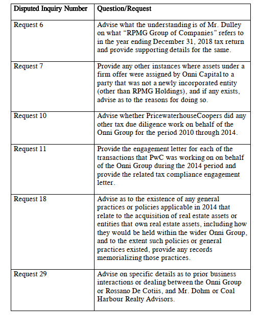 ) to answer the Respondent’s questions and requests made at the examination for discovery of Onni’s nominee, which are set out in Appendix A to the within Order (the“Disputed Inquiries”