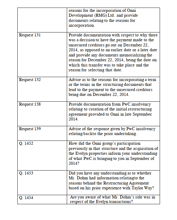 [113] It is Onni’s position that these requests are improper because they are based on an assumption that there was a positive decision to make these payments on a particular date in the absence of any statements or evidence given at the examination that a positive decision as to a particular date was made. It also specifically objects to Request 132 on the basis that it is overbroad. In its view, if the Respondent wishes to know the reason for a particular term, it should specifically identify the term at issue and put it to the nominee.