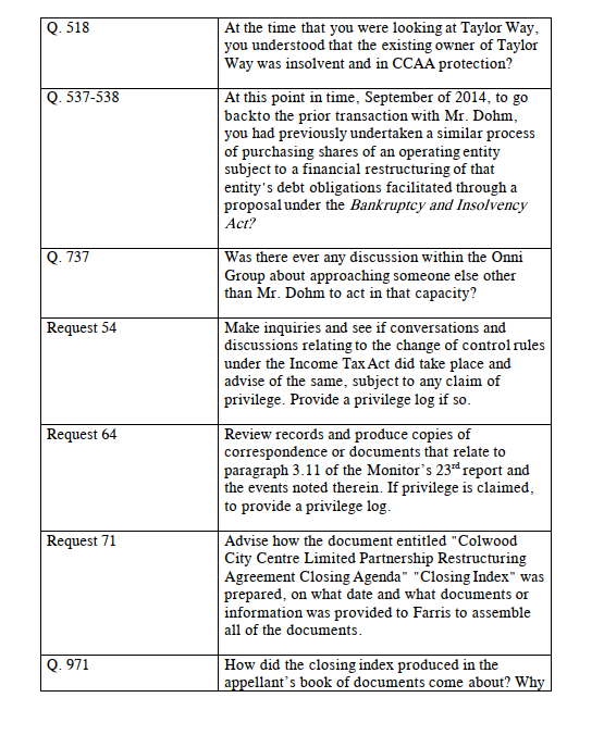 [83] Each of these requests and questions goes to the preparation of the closing index for the Colwood Project Restructuring. Onni says that from these requests it appears that the Respondent is of the view that a closing index is representative of what transactions constitute a series of transactions. It is Onni’s position that even if that view is correct these questions and requests are not proper because: