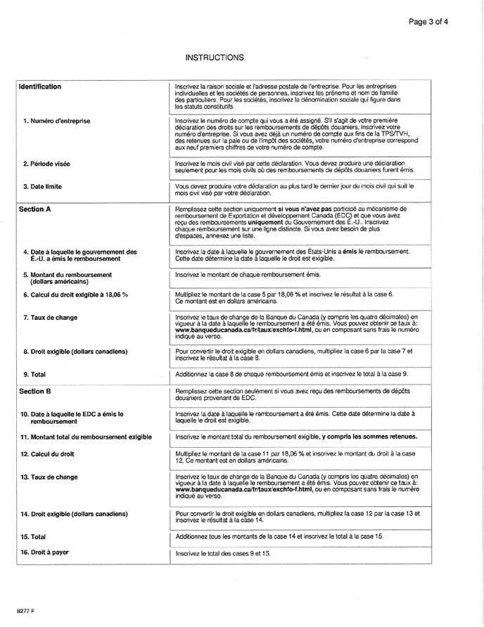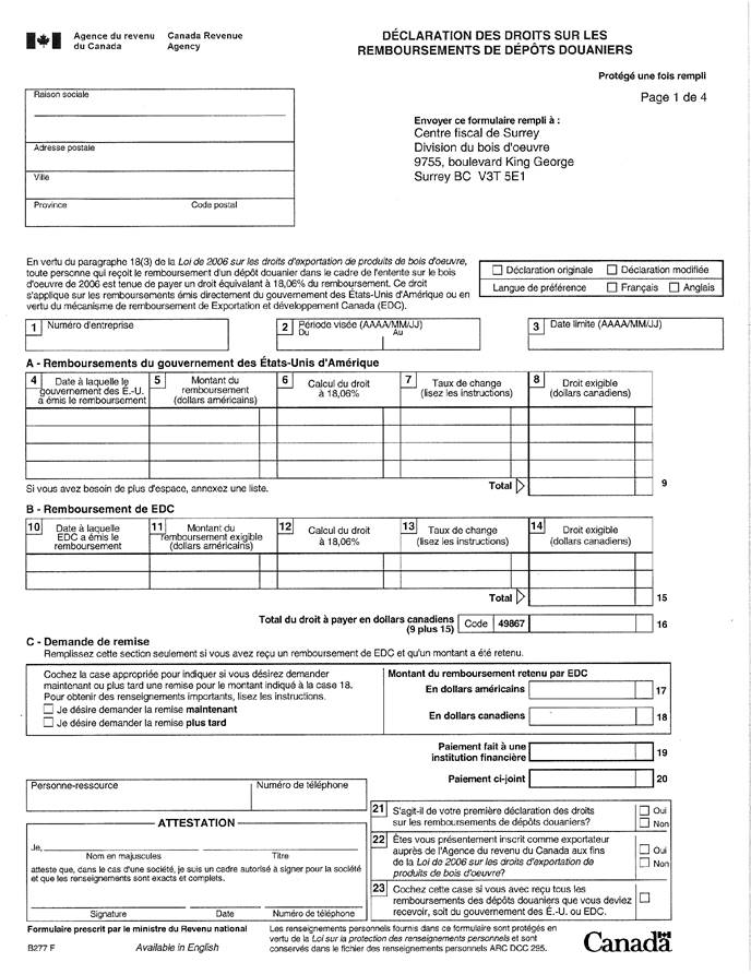 Pour produire la déclaration et payer les dépôts douaniers, Oroville Reman & Reload Inc. doit produire le formulaire B277 ci-joint, Déclaration de droits sur les remboursements de dépôts douaniers, et poster le formulaire rempli à l’adresse indiquée ci-dessous.
