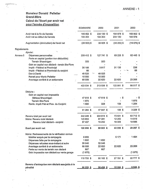 [23] Elle a pris le soin de faire confirmer par l'appelant tous les éléments ayant servis aux calculs de l'avoir net. Le total de l'écart pour les trois années d'imposition est de 160 958 $. La vérificatrice a, par la suite, réussi à faire certains redressements de cette somme et elle a été capable d'identifier des sources de dépenses pour un total de 110 773 $ pour les trois années en question, laissant un montant total de 50 225 $ de revenus d'entreprises non déclarés pour les trois années d'imposition. C'est ce dernier montant qui a servi au calcul de la pénalité en vertu du paragraphe 163(2) de la Loi. Pour les fins du dossier, je reproduis en entier l'annexe-1 des calculs de l'écart par avoir net.
