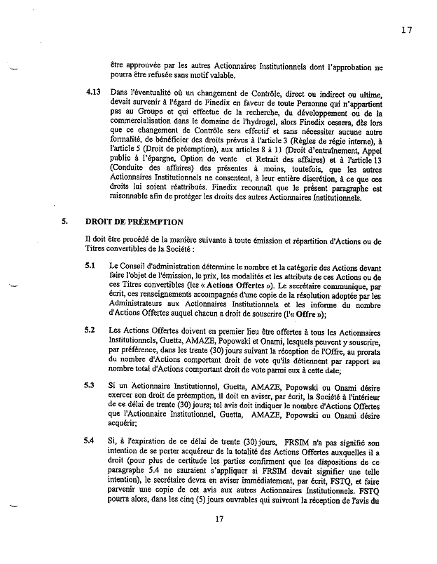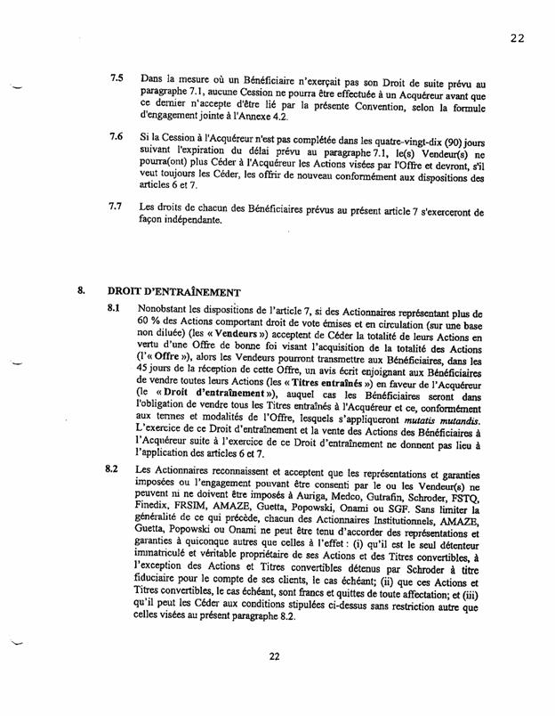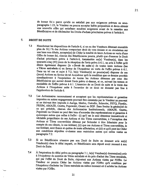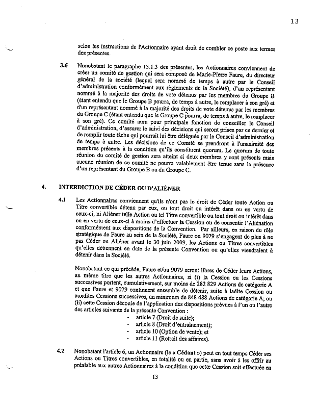 ·        Le paragraphe 13.4 stipule qu’« aucune émission de valeur mobilière de la Société ne sera réalisée sans l’accord préalable exprès des actionnaires représentant 50 % au moins du capital social sur une base non diluée. »