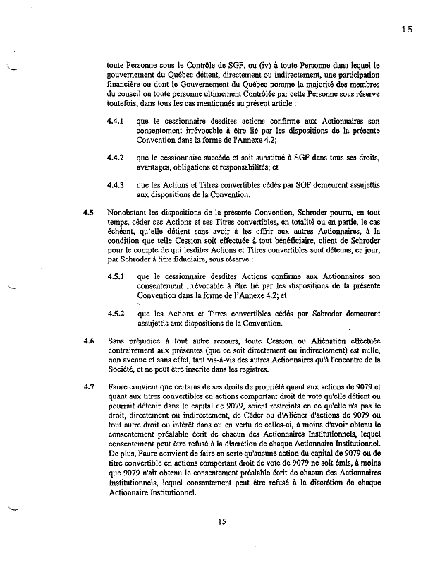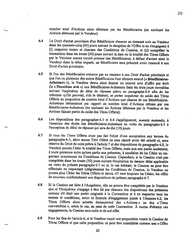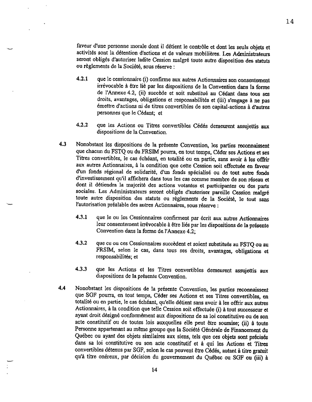 ·        Les paragraphes 4.2 et 4.3 prévoient deux situations dans lesquelles certains actionnaires seront autorisés à céder, sous certaines conditions, leurs actions et « les Administrateurs seront obligés d’autoriser pareille Cession malgré toute autre disposition des statuts ou règlements de la Société. »