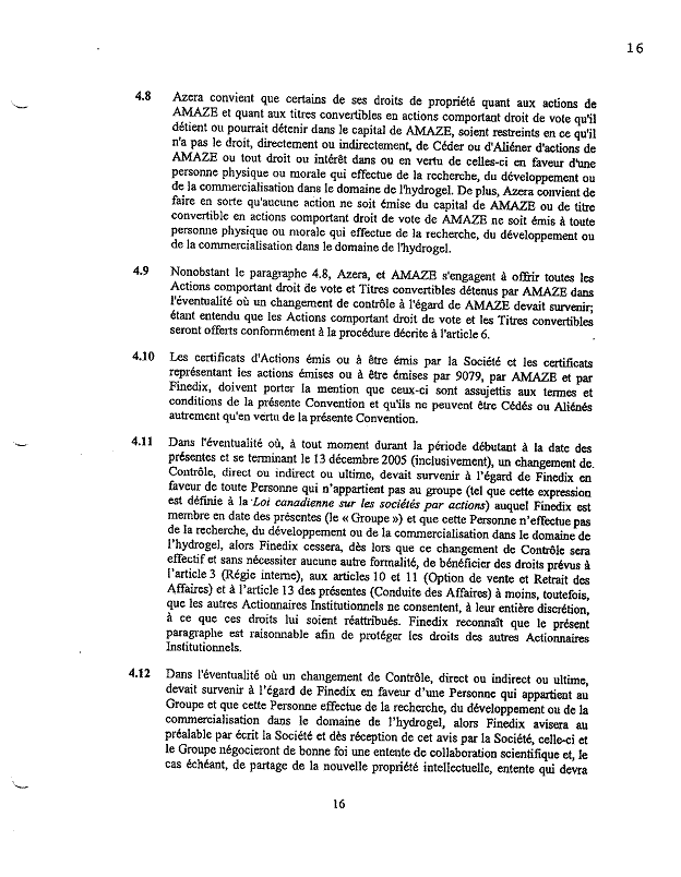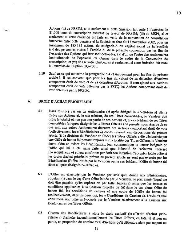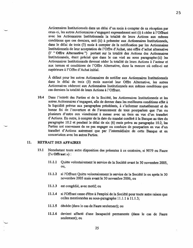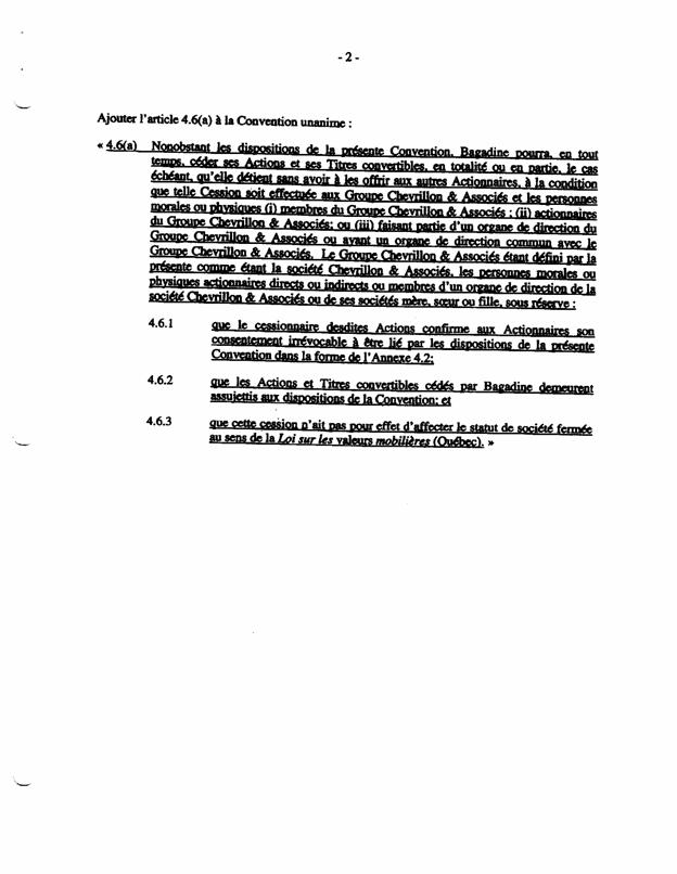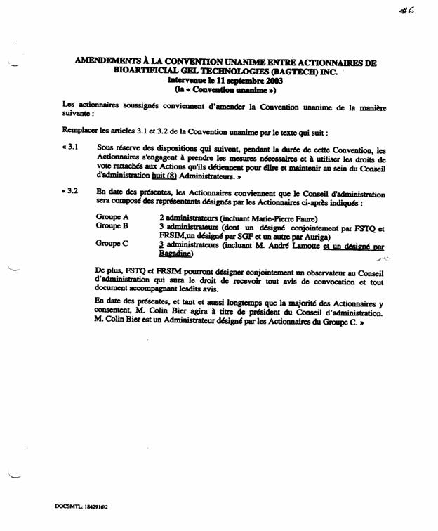 1.25          Suite à la souscription d’actions par ces investisseurs au capital-actions de Bagtech, les clauses 3.1 et 3.2 de la CUA furent modifiées par amendement à la CUA en date du 22 juillet 2005 pour y indiquer que le nombre d’administrateurs de Bagtech passerait de 7 à 8, et que le nombre d’administrateurs nommés par le Groupe C passerait de 2 à 3, dont l’un d’eux serait désigné par Bagadine.