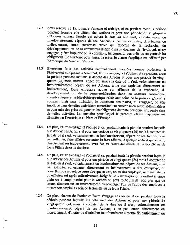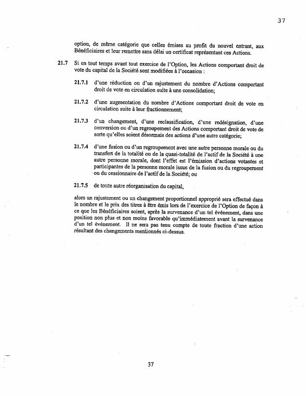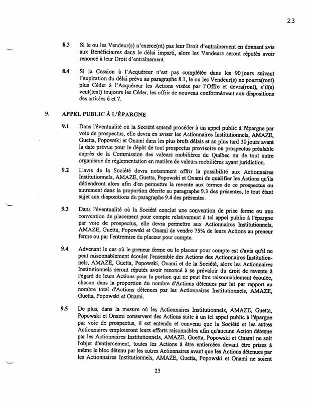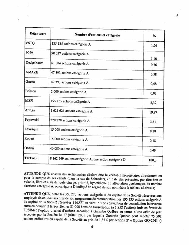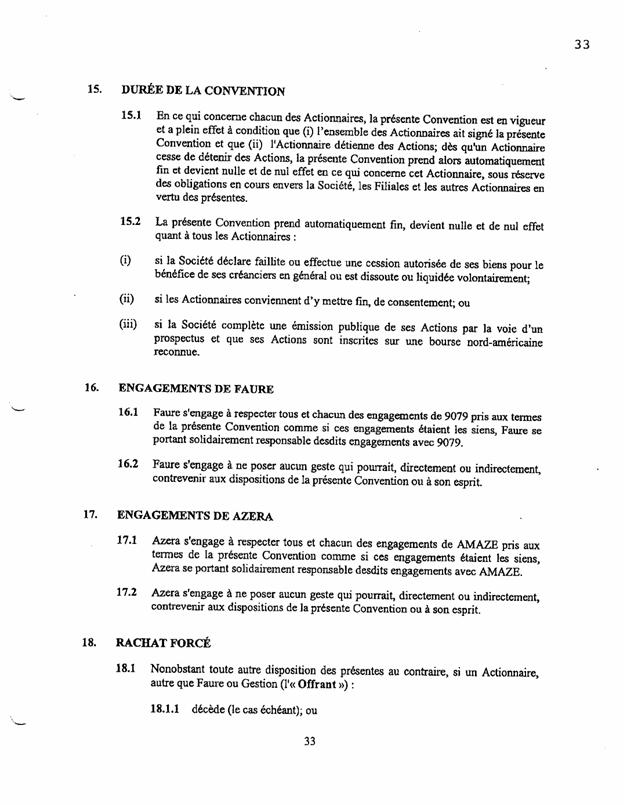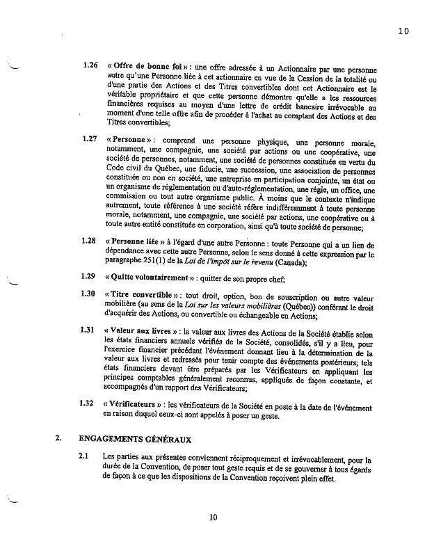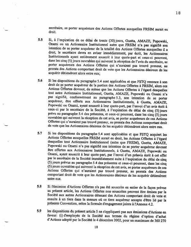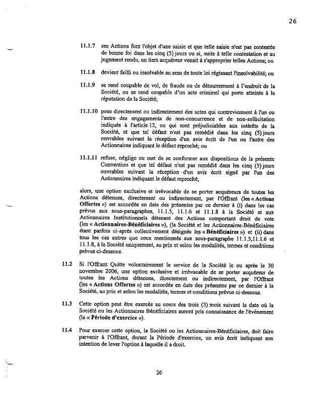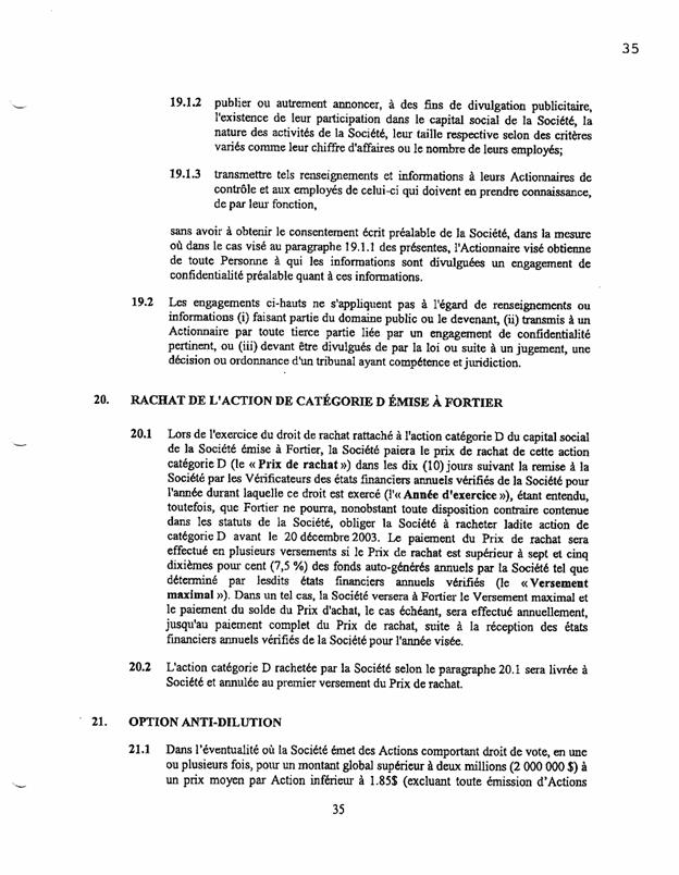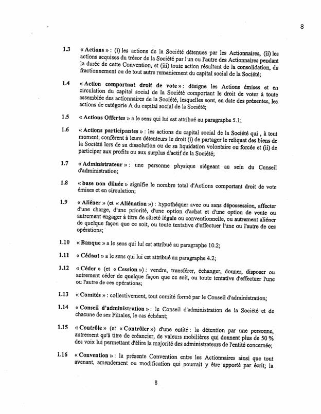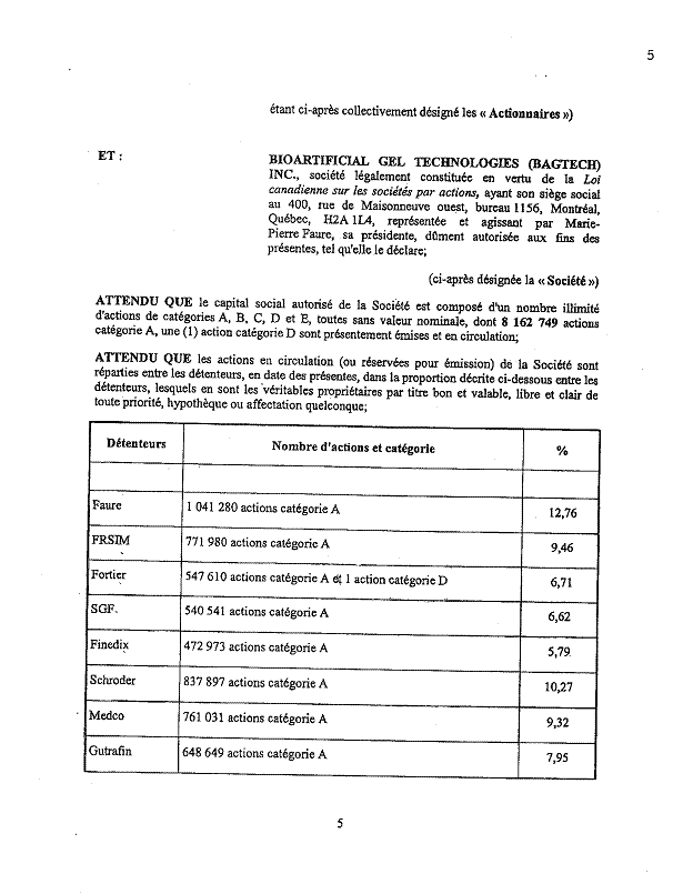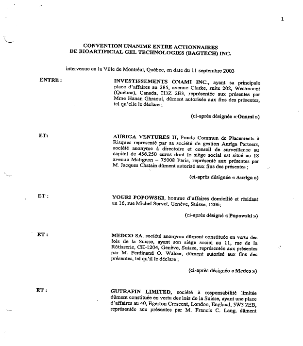 1.18          Le 11 septembre 2003, les actionnaires de Bagtech ont signé un document intitulé « convention unanime entre actionnaires » (« CUA ») comportant notamment les clauses suivantes :