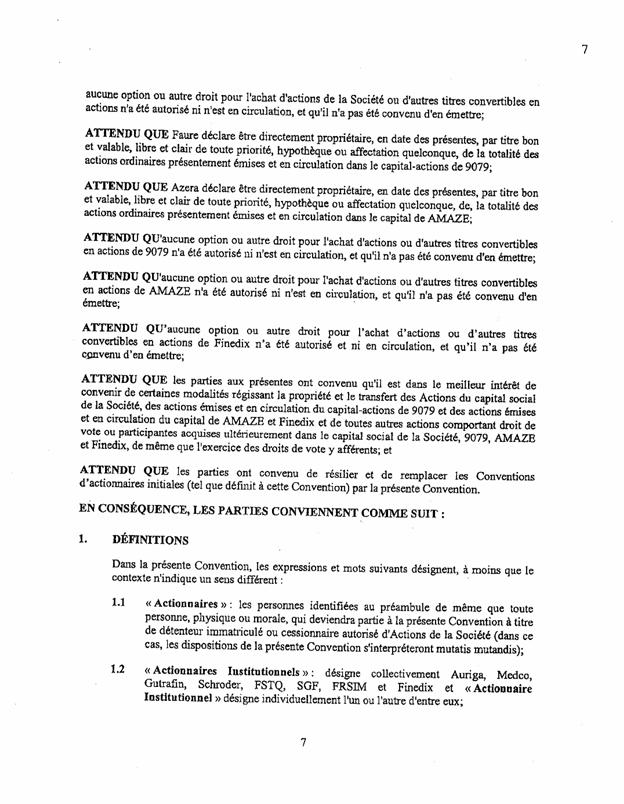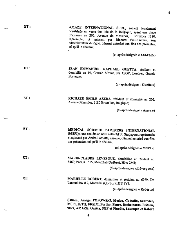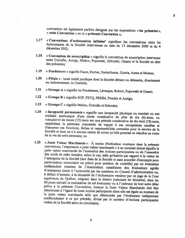 1.19          En vertu de la définition présentée à l’article 1.21 de la CUA, le Groupe A se compose des actionnaires suivants : Mme Marie-Pierre Faure (« Faure »), Fortier, M. Richard J. Deckelbaum (« Deckelbaum »), M. Jean Emmanuel Raphael Guetta (« Guetta »), Amaze par le biais de son administrateur délégué, M. Richard Émile Azera (« Amaze »), M. Jean-François Brisson (« Brisson »), Mme Marie-Claude Lévesque (« Lévesque »), Mme Marielle Robert (« Robert »), Popowski et Onami.