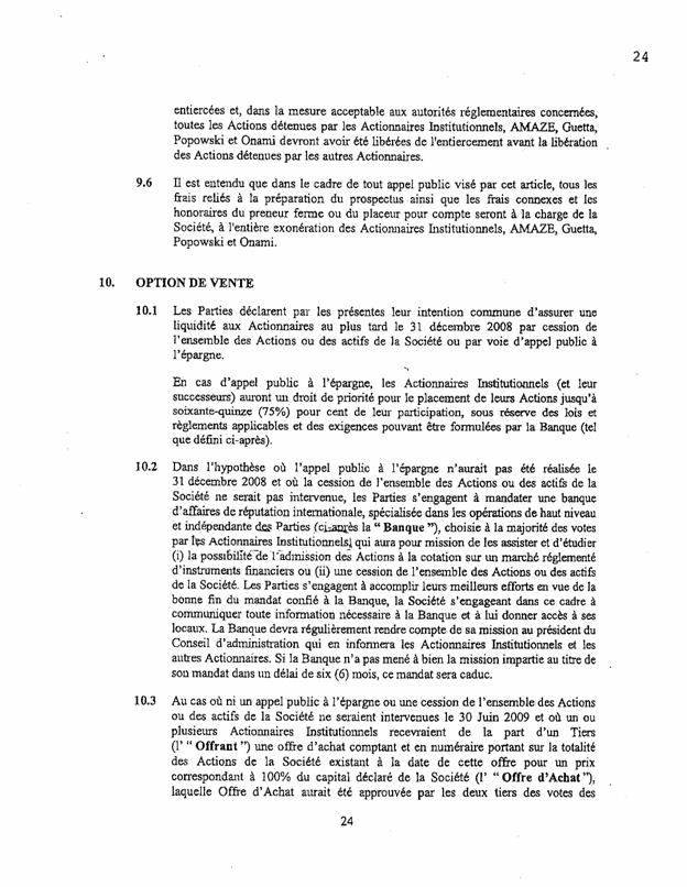 ·        Le paragraphe 10.2 prévoit que « dans l’hypothèse où l’appel public à l’épargne n’aurait pas été réalisée le 31 décembre 2008 et où la cession de l’ensemble des Actions ou des actifs de la Société ne serait pas intervenue, les Parties s’engagent à mandater une banque choisie à la majorité des votes par les Actionnaires Institutionnels, qui aura pour mission de les assister et d’étudier » certaines questions.