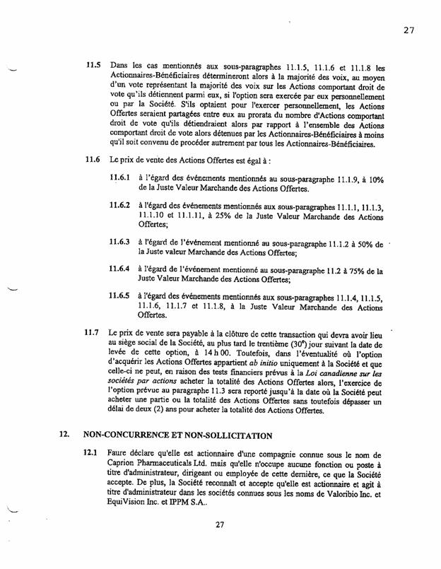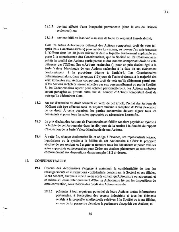 ·        Les paragraphes 11.5 et 18.1 prévoient que si un actionnaire décide, devient affecté d’une incapacité permanente ou devient failli ou insolvable, « les coactionnaires détermineront […] à la majorité des voix […] si les Actions rachetées seront achetées par eux personnellement ou par la Société. »
