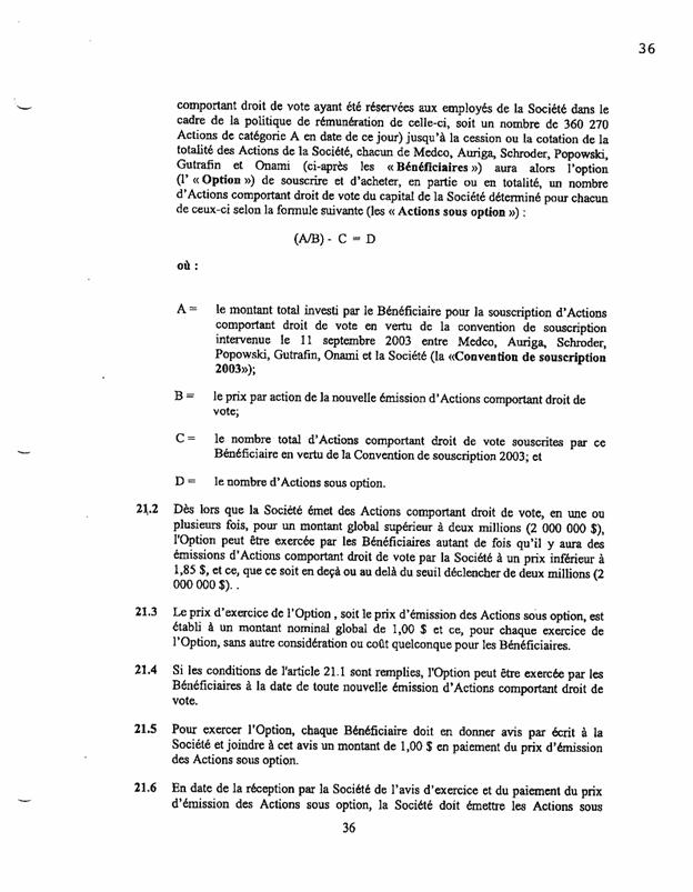 1.21          En vertu de la définition présentée à l’article 1.22 de la CUA, le Groupe C se compose des actionnaires suivants : Medco, Gutrafin et Schroder, lequel désigne deux administrateurs, dont M. Collin Bier qui agira à titre de président du conseil d’administration.