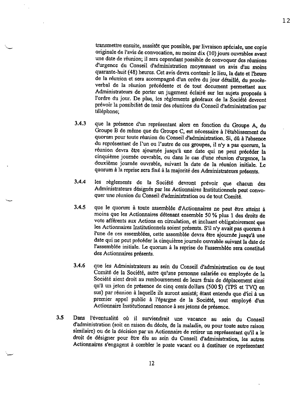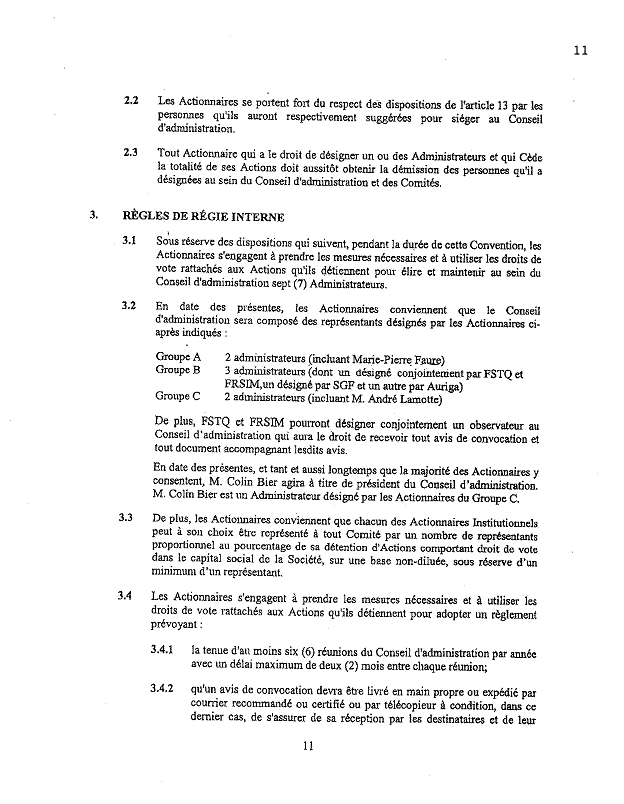 ·        Selon le paragraphe 3.2, « tant et aussi lomgtemps que la majorité des Actionnaires y consentent, M. Colin Bier agira à titre de président du Conseil d’administration ». On retire ainsi aux administrateurs, du moins temporairement, le pouvoir de nommer le président du conseil.