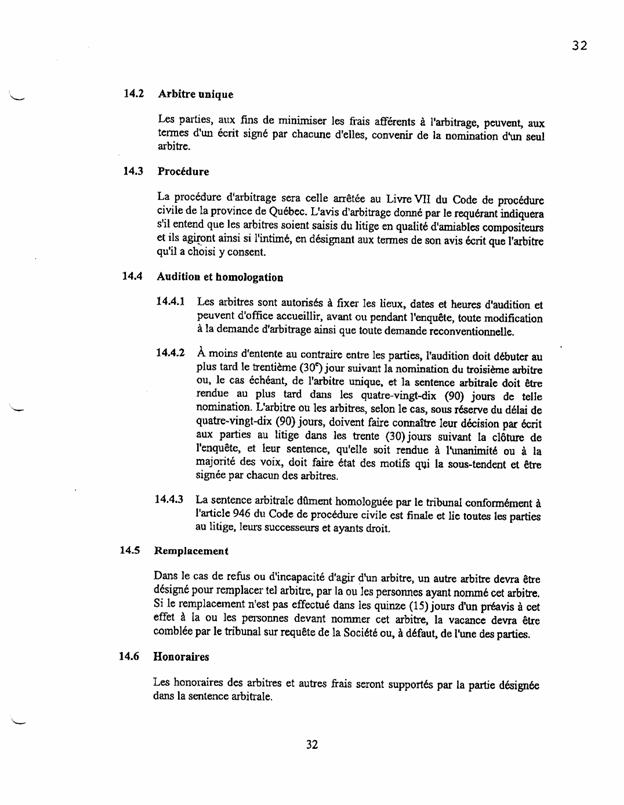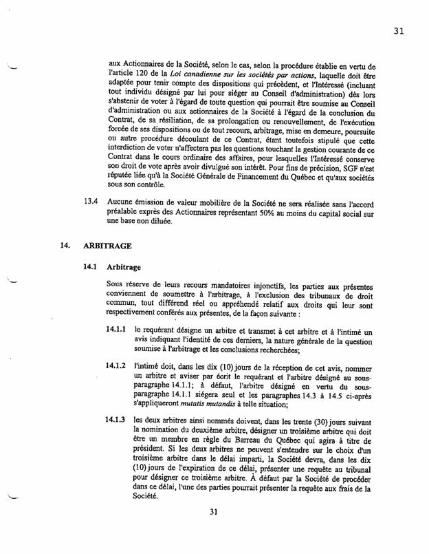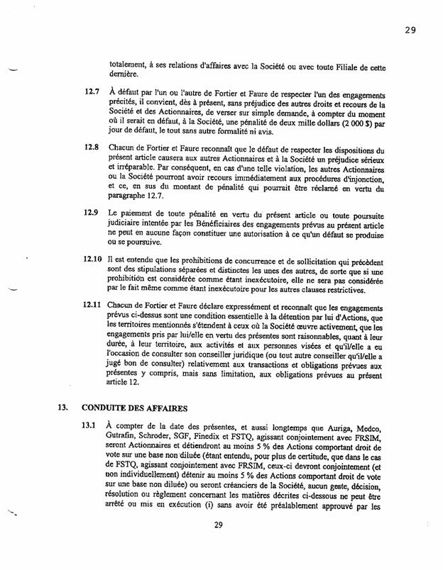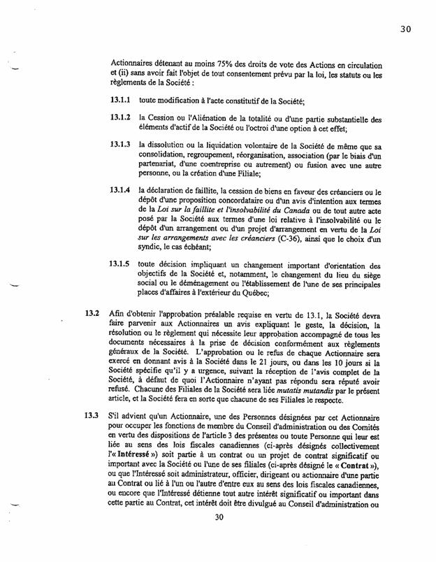 ·        Le paragraphe 13.1 prévoit que plusieurs décisions qui devraient normalement être ratifiées par une résolution spéciale des actionnaires (donc aux deux tiers des voies, selon le paragraphe 2(1) de la L.c.s.a.) doivent être acceptées aux trois quarts des voix.