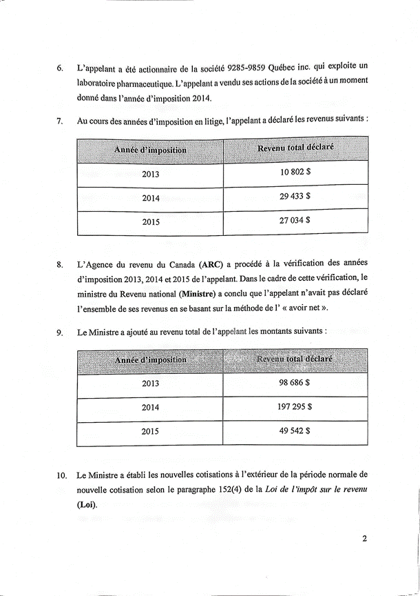 [7] Au cours de l’audience, l’intimé a concédé un montant de 10 000 $ pour l’année d’imposition 2015 à l’égard des actions de 9285-9859 Québec inc., réduisant ainsi le montant de revenus additionnels non déclarés à 39 542,14 $ pour l’année d’imposition 2015.