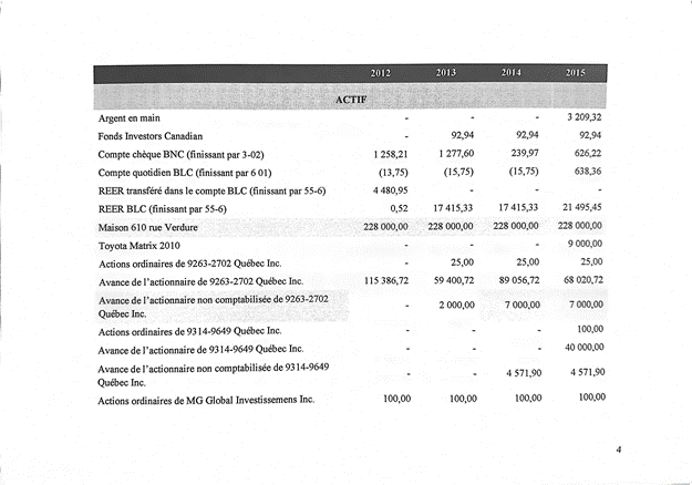 [200] Toutefois, M. Raymond n’a pas accepté que les sommes totalisant 4 948,14 $ qui ont été versées par M. Abderrazeq Eddahir à M. Gouriche par virements bancaires au cours des années 2013 à 2015 soient appliquées en réduction de l’avoir net, puisque M. Gouriche ne lui a montré qu’un seul chèque fait à Revenu Québec le 24 janvier 2013 pour 1 553,74 $. Ces virements totalisent 1 640 $ en 2013, 556,18 $ en 2014, et 2 751,96 $ en 2015.