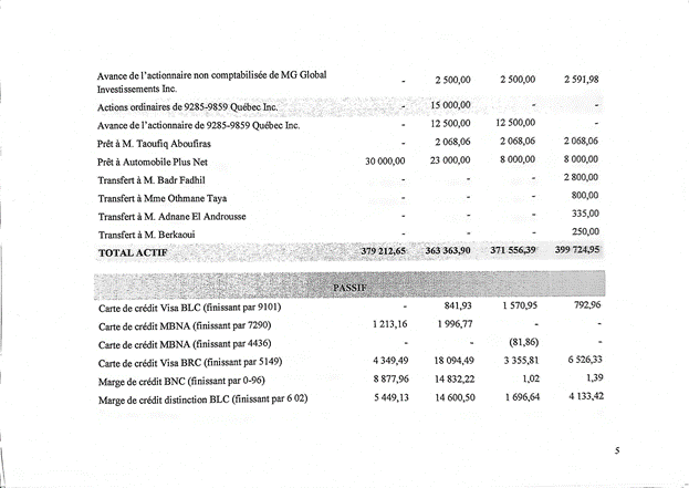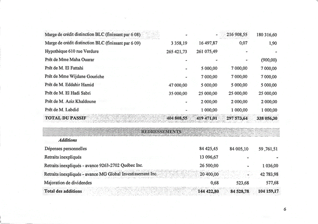 [201] Vu la preuve présentée par M. Gouriche, je conclus, selon la prépondérance des probabilités, que les montants versés par M. Abderrazeq Eddahir sont des remboursements versés à M. Gouriche. Ainsi, des ajustements en réduction dans le calcul de l’avoir net pour un montant de 1 640 $ en 2013, 556,18 $ en 2014, et 2 751,96 $ en 2015 doivent être effectués.