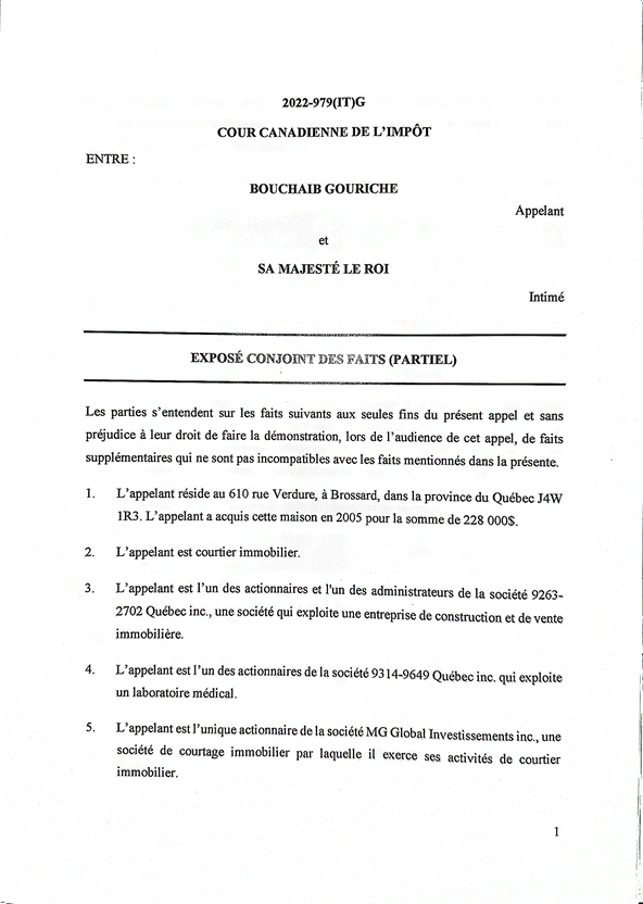 [4] À l’audience, M. Gouriche s’est représenté seul. L’intimé a présenté sa preuve en premier et a appelé 2 témoins, soit M. Nicolas Raymond, le vérificateur à l’Agence du revenu du Canada (l’« ARC »